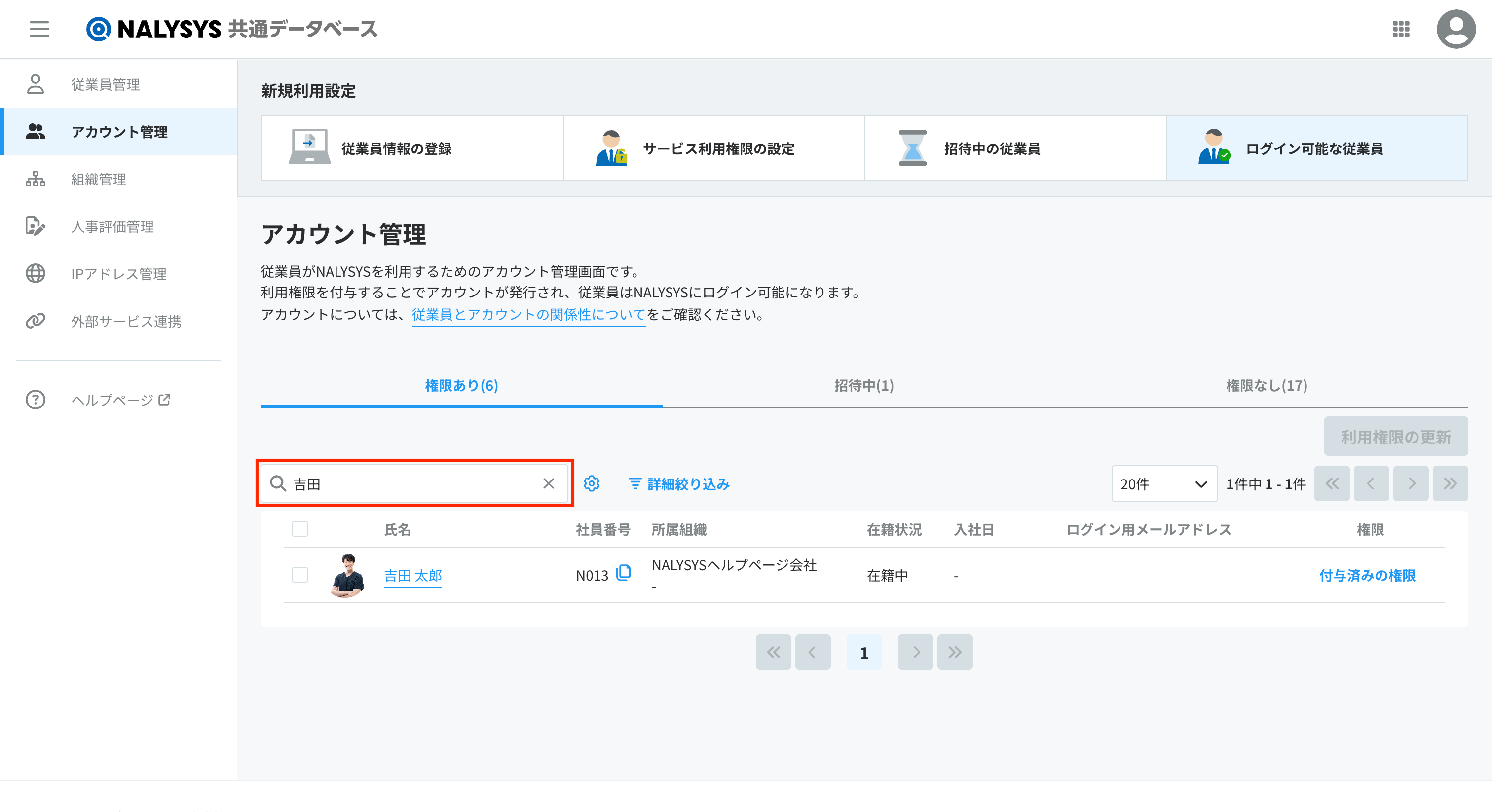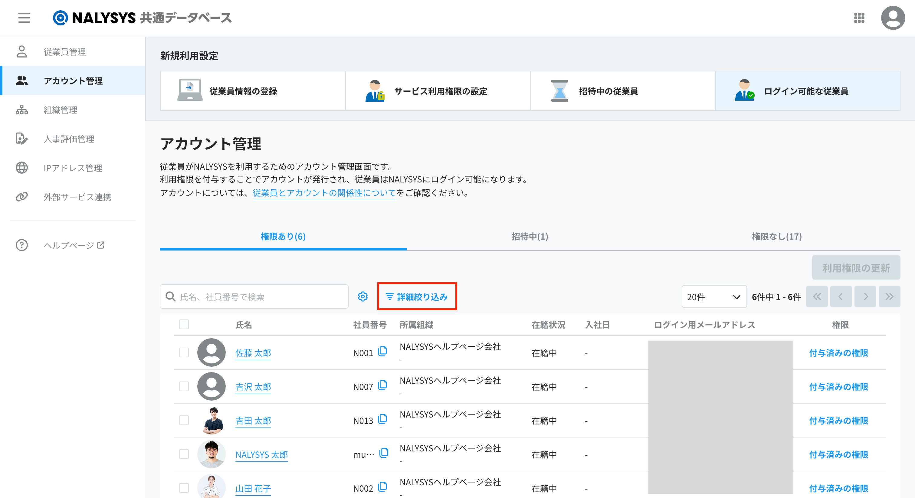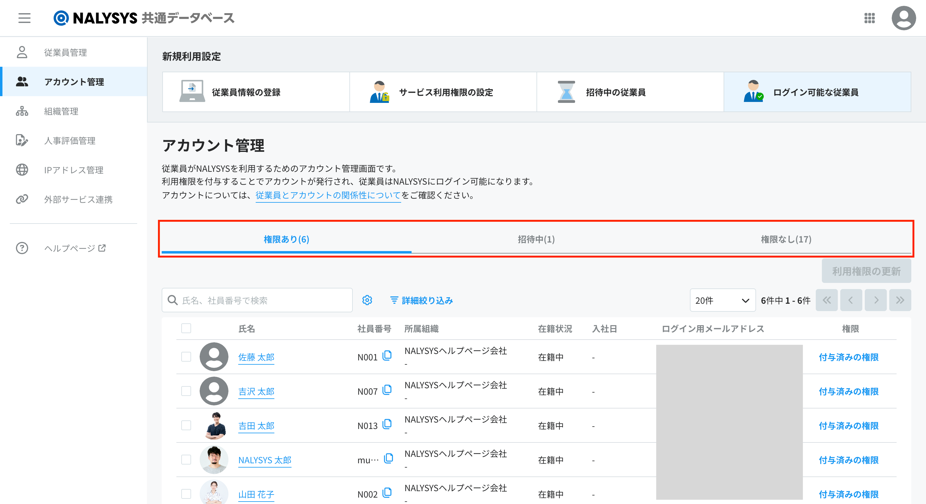 アカウント情報は、利用権限の付与状況によってタブで管理されます。