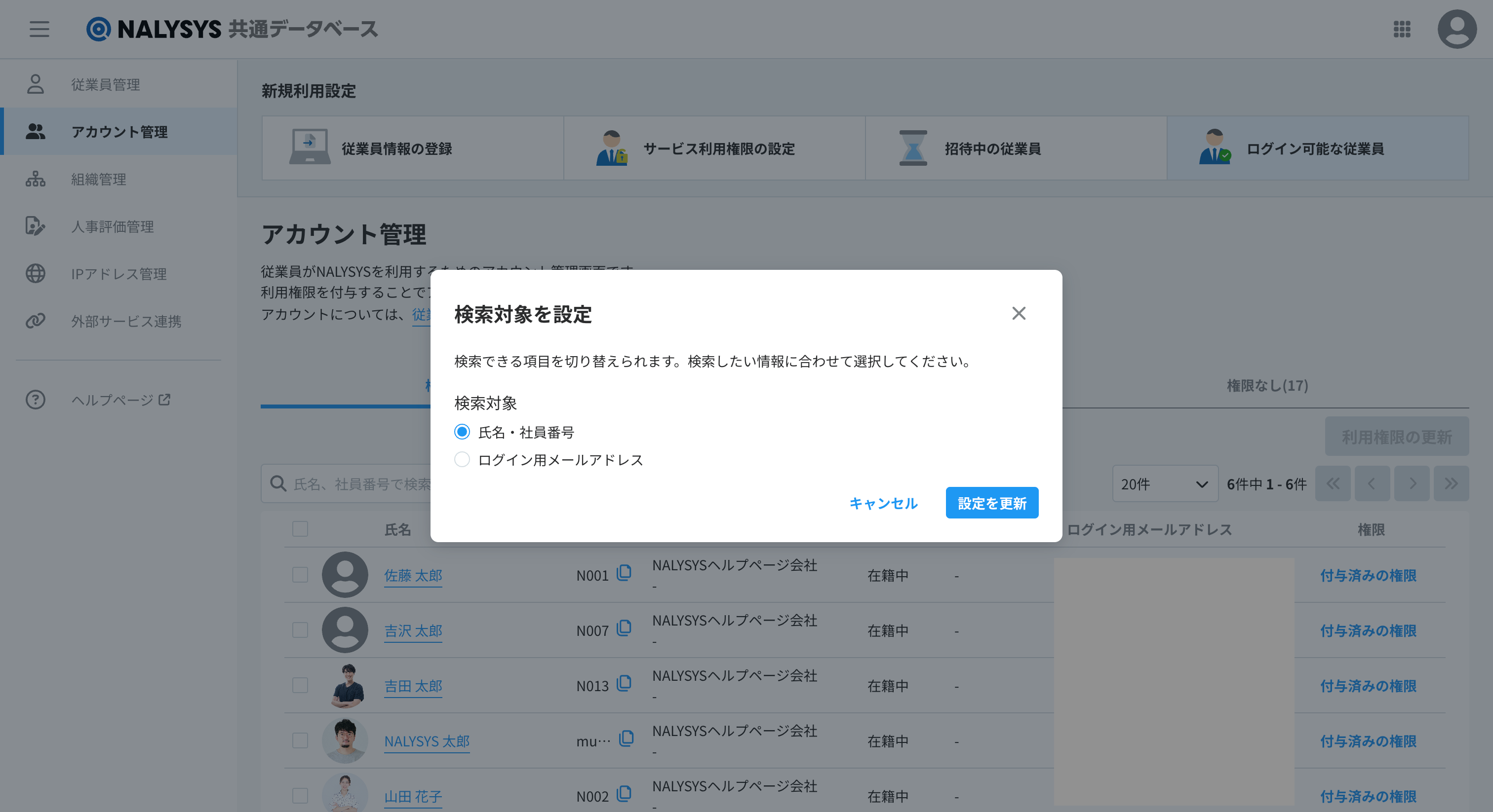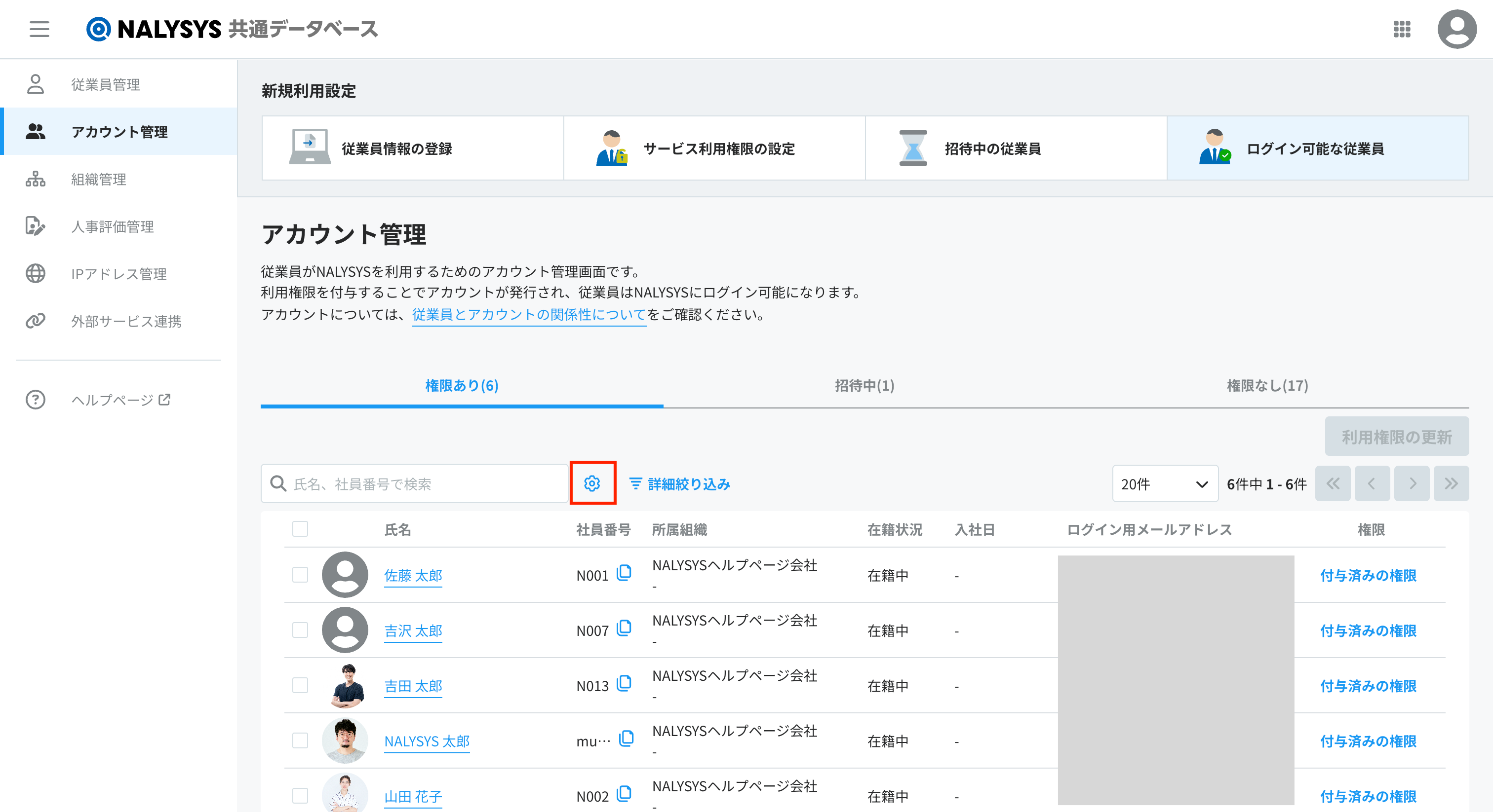 | 権限あり | 氏名(漢字、カナ) 社員番号 ログイン用メールアドレス |