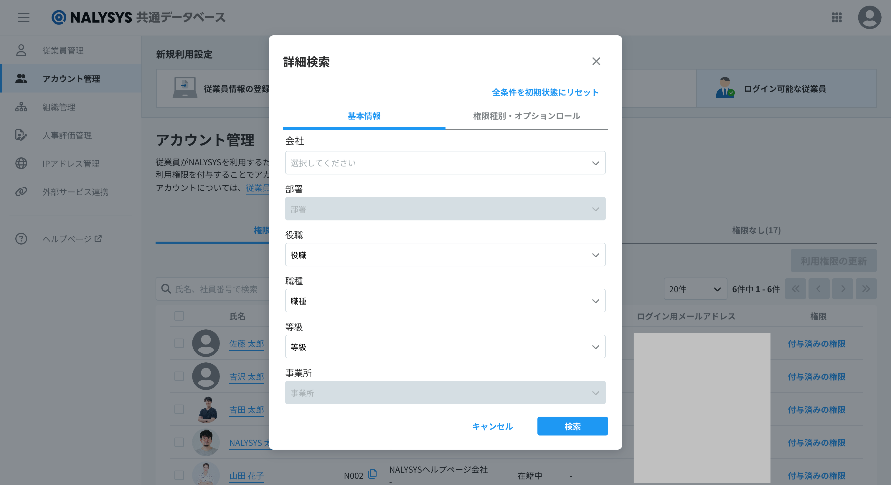 部署、在籍状況、メールアドレスの有無などで検索します。