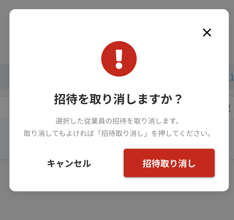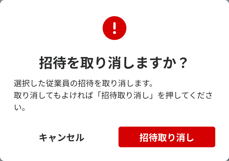 招待を取り消しますか?という確認ダイアログが表示されるため、問題ないことを確認した後、「招待取り消し」を押してください。