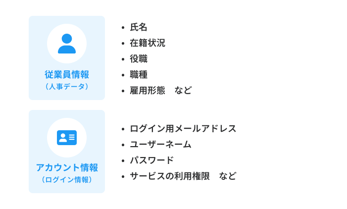 メールアドレス、パスワード、各サービスの利用権限などの情報が含まれます。