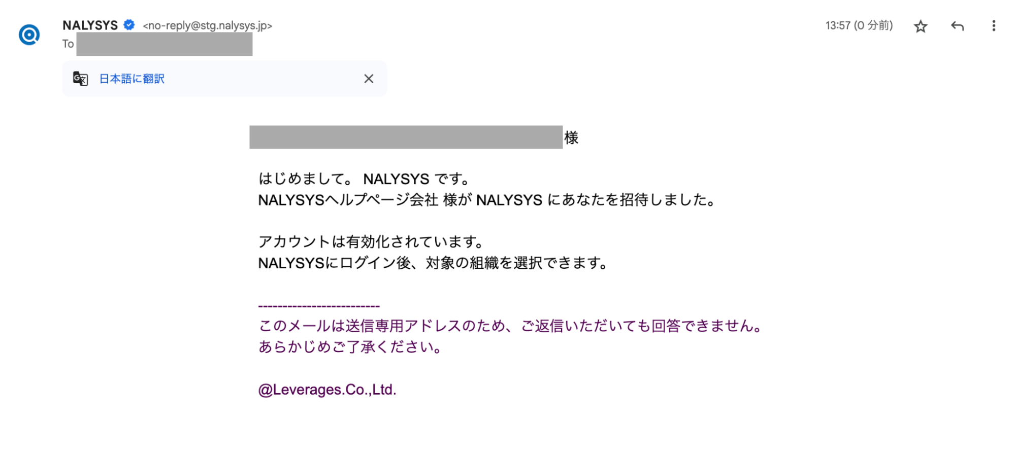 NALYSYSにログイン後、対象の組織を選択できます」というメールが送信されます。