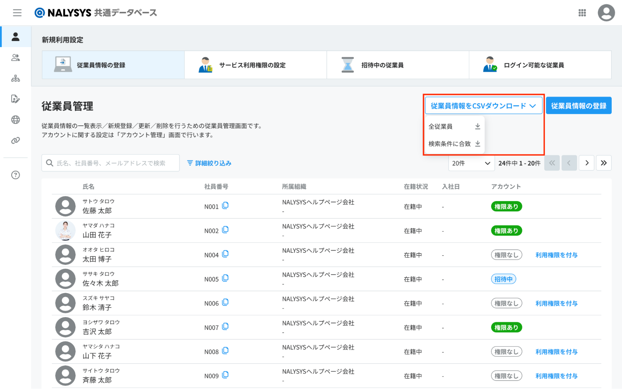 本ページでは、登録済みの従業員情報をcsvダウンロードする手順をご説明します。