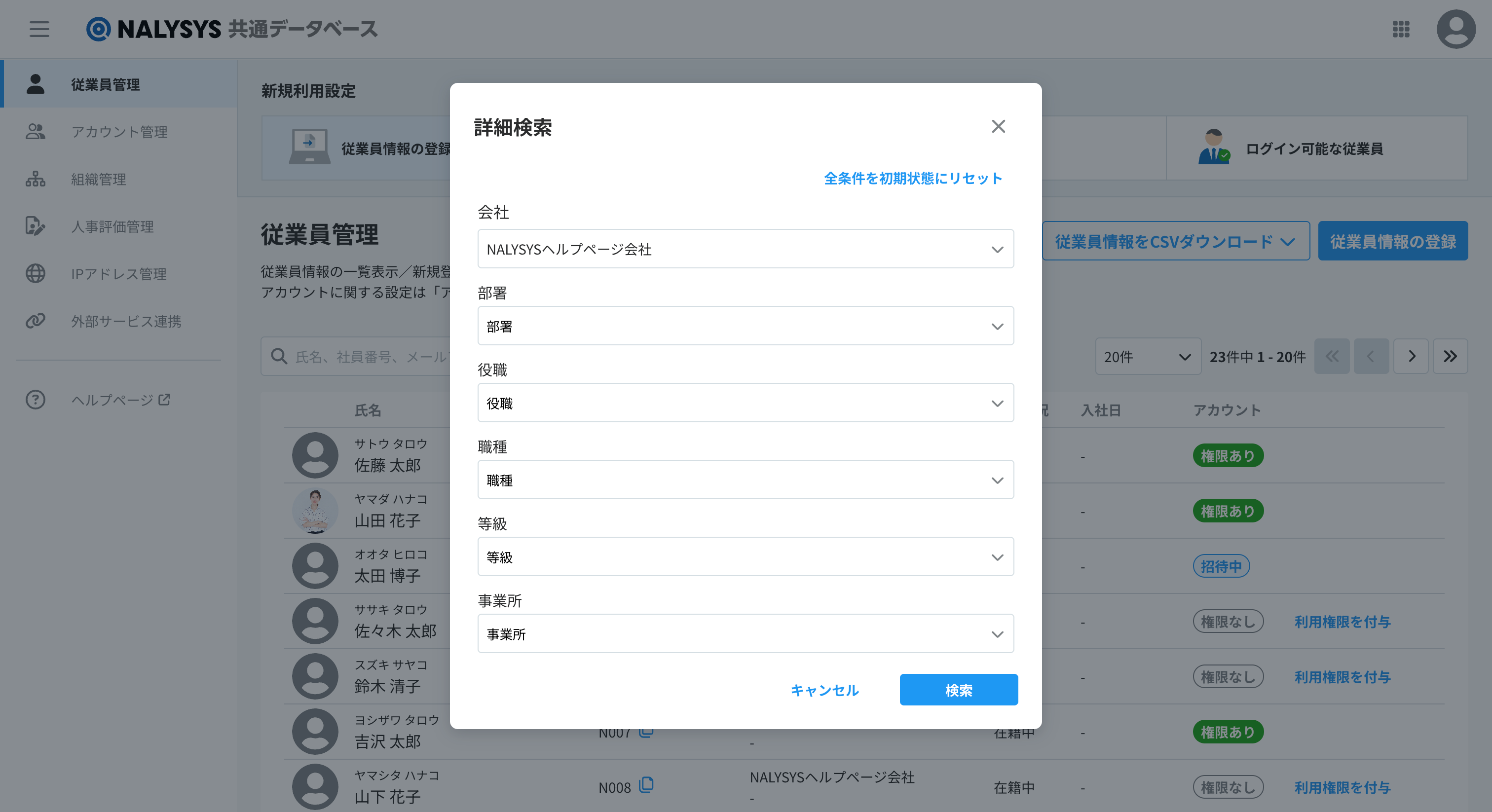 部署、在籍状況、メールアドレスの有無などで検索します。