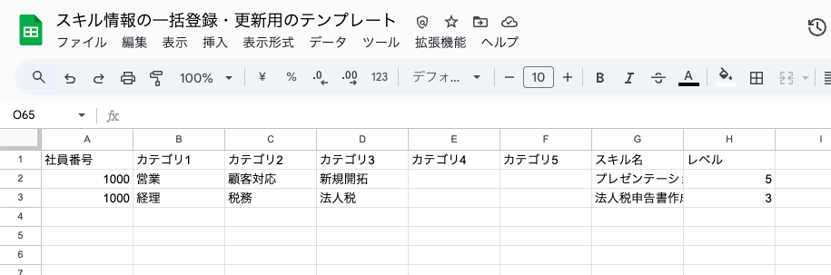 ダウンロードしたテンプレートファイルを編集し、スキルを登録したい社員の社員番号とスキルカテゴリ、スキル名、レベルの情報を入力します。