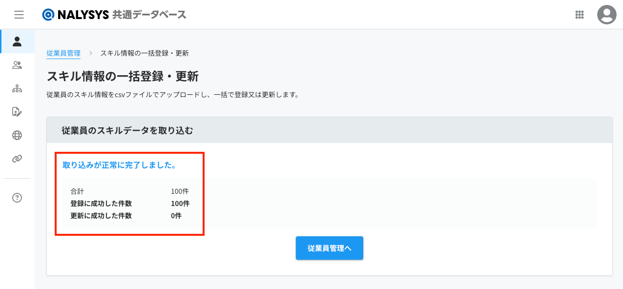 「一括登録を開始」ボタンを押すとスキルスキル情報のインポートが開始されます。