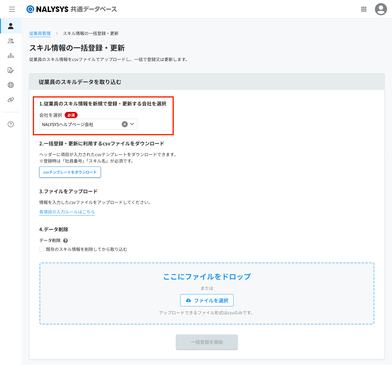 スキル情報を登録する会社を選択したのち、「ファイルを選択」ボタンを押してファイルをアップロードしてください。ファイルをアップロードすると「一括登録を開始」ボタンを押すことができるようになります。