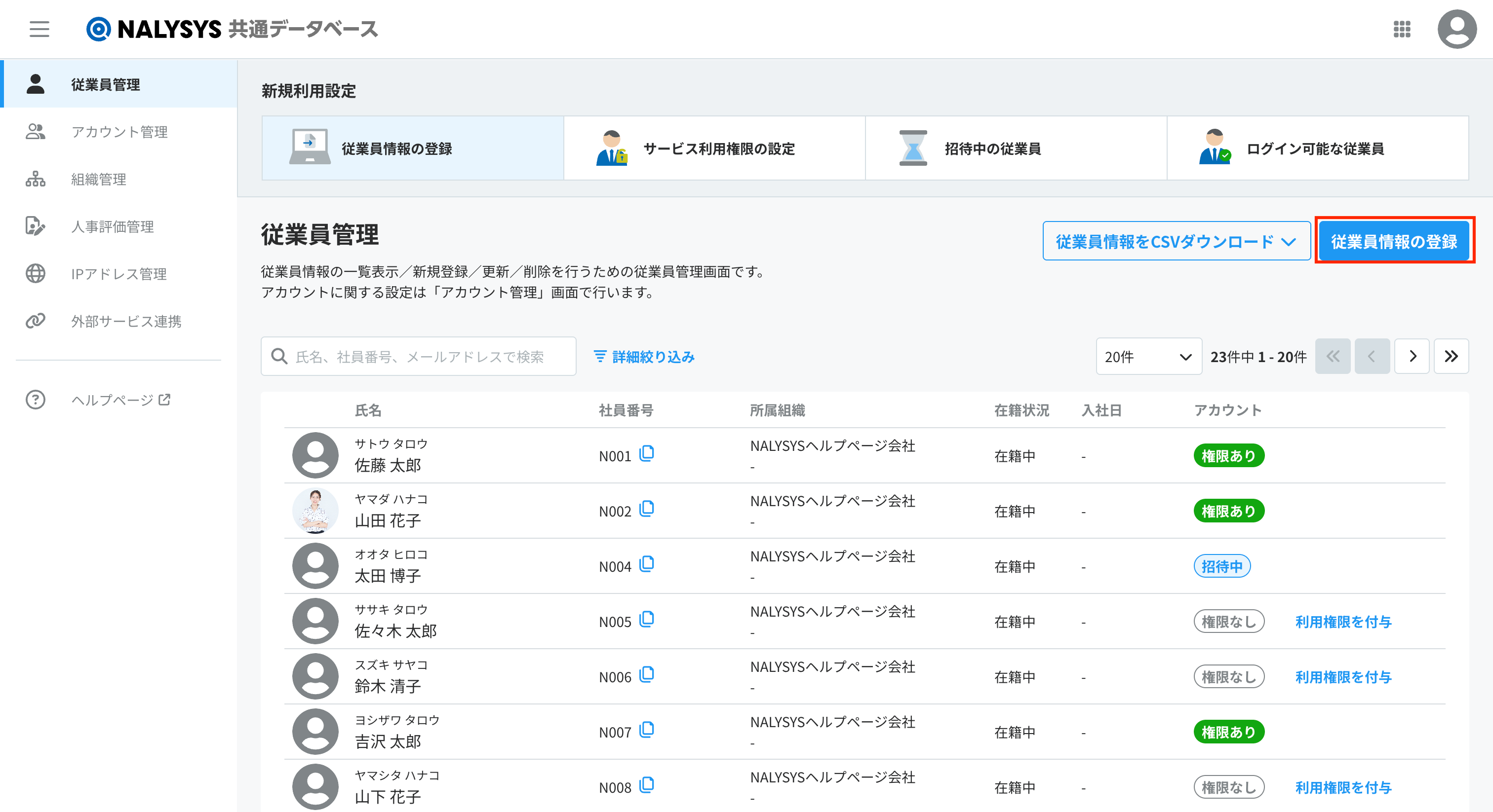 サイドバーの「従業員管理」を押すと、従業員管理画面に遷移します。