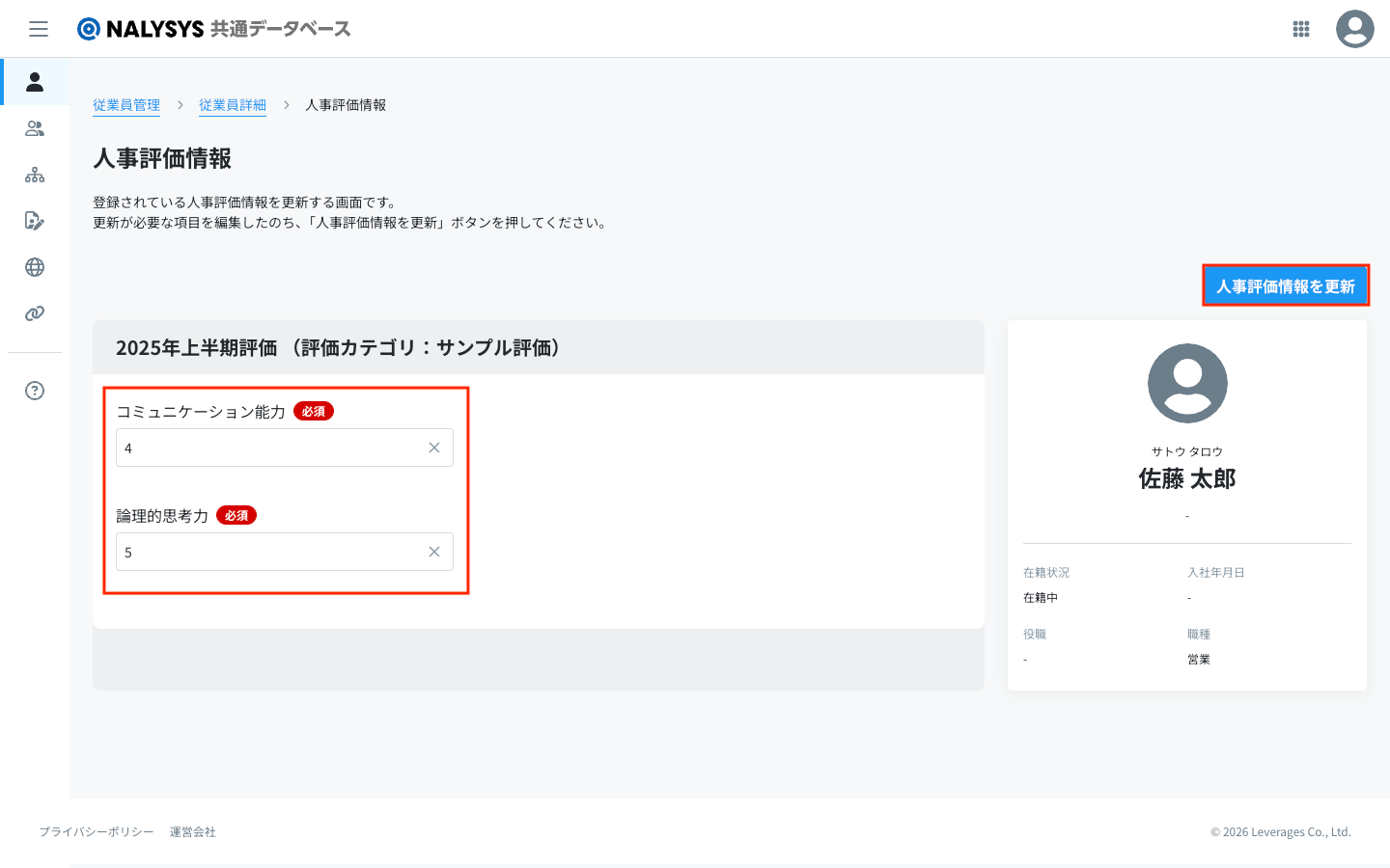 評価情報を設定して、問題がなければ「人事評価情報を更新」を押してください。