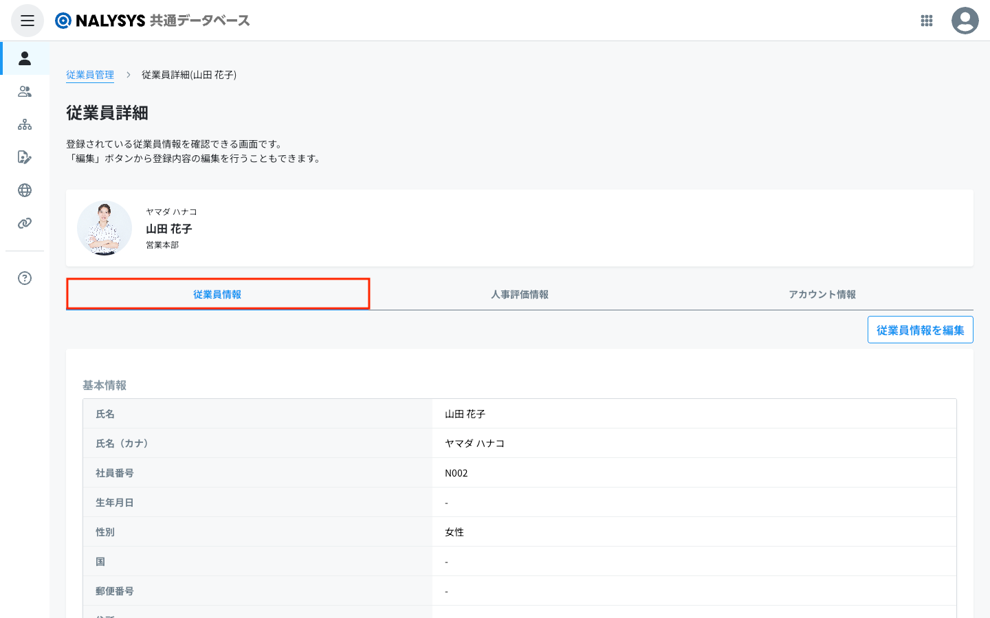 従業員詳細画面の従業員情報タブが表示されます。