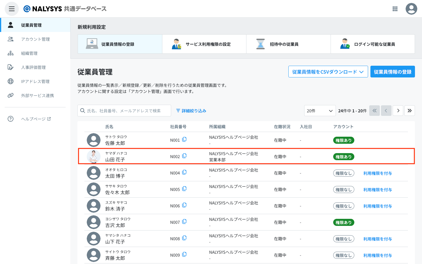 サイドバーの「従業員管理」を押すと、従業員管理画面に遷移します。