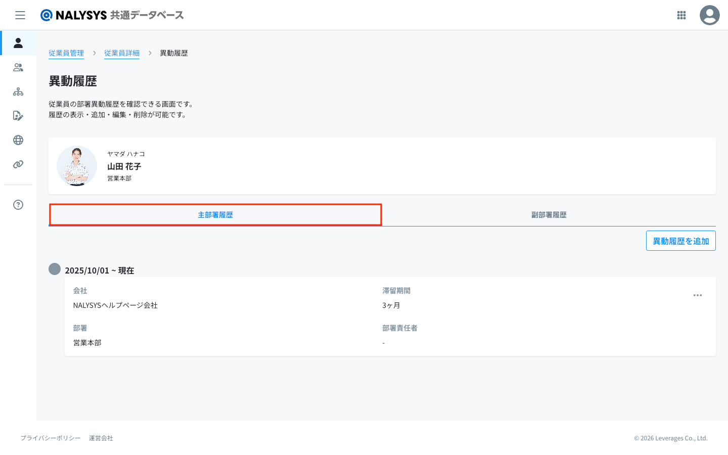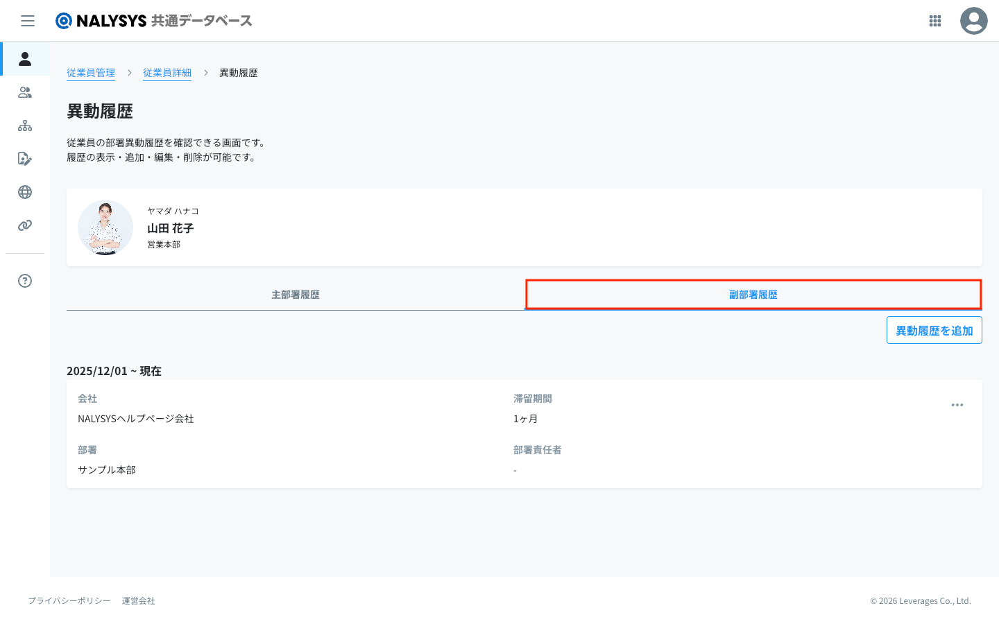 副部署履歴のタブを押すことで副部署の履歴を確認することができます。