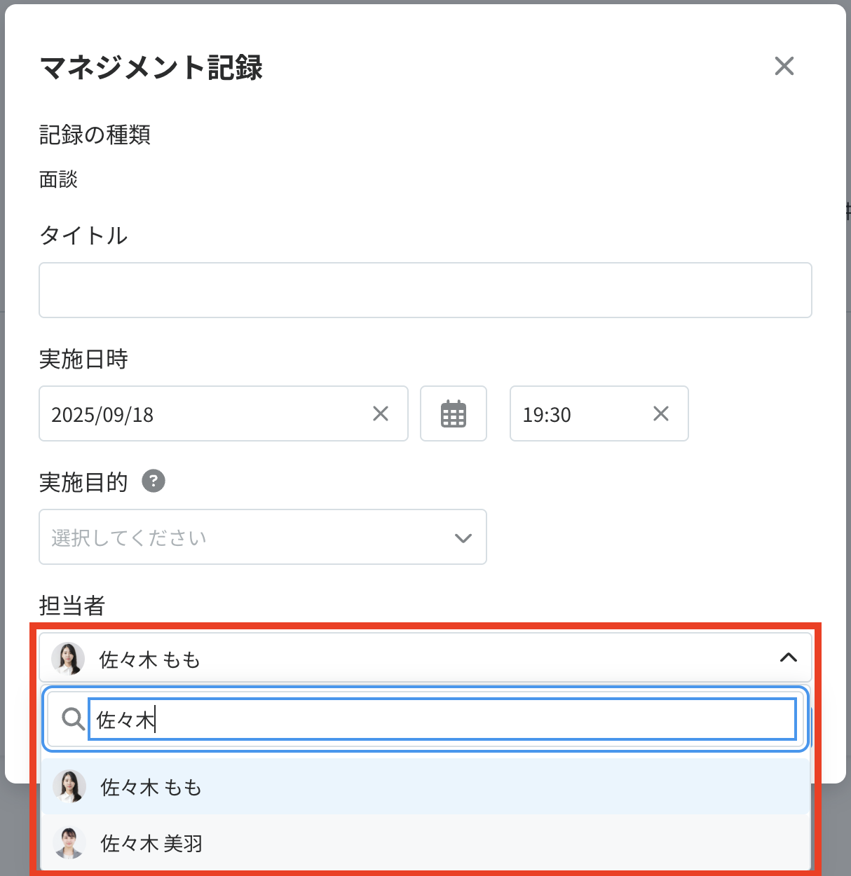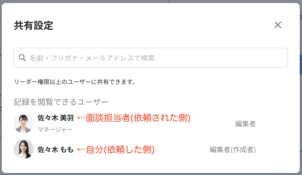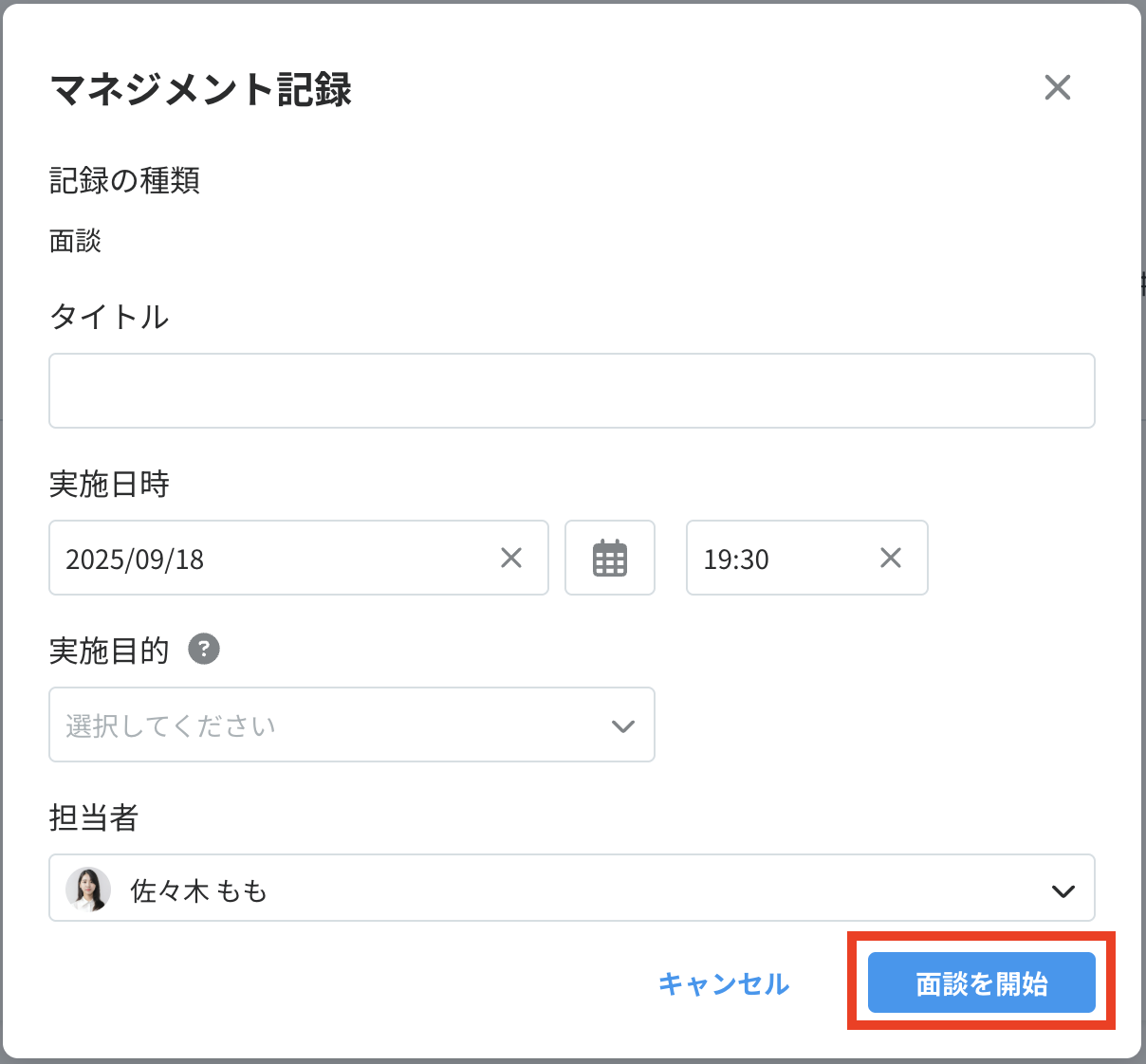 面談担当者を変更して「面談を開始」すると、自分と面談担当者の2人が編集可能なマネジメント記録が作成されます。
