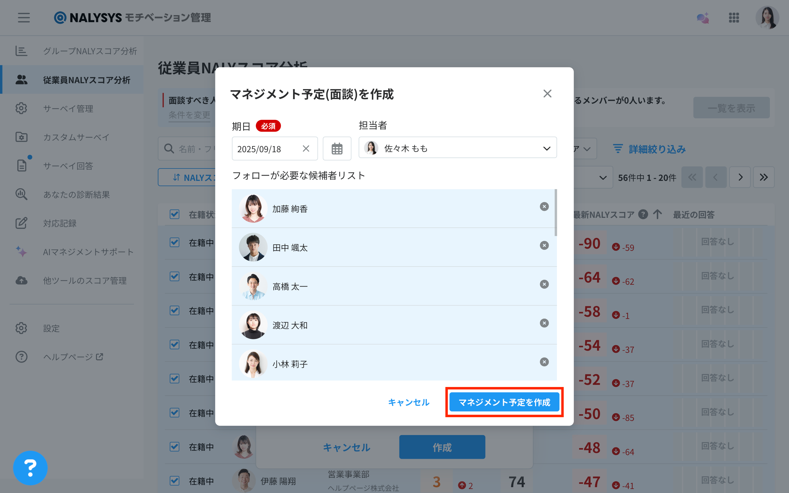 期日と担当者を設定して、「マネジメント予定を作成」を押すと、面談の予定が入ります。