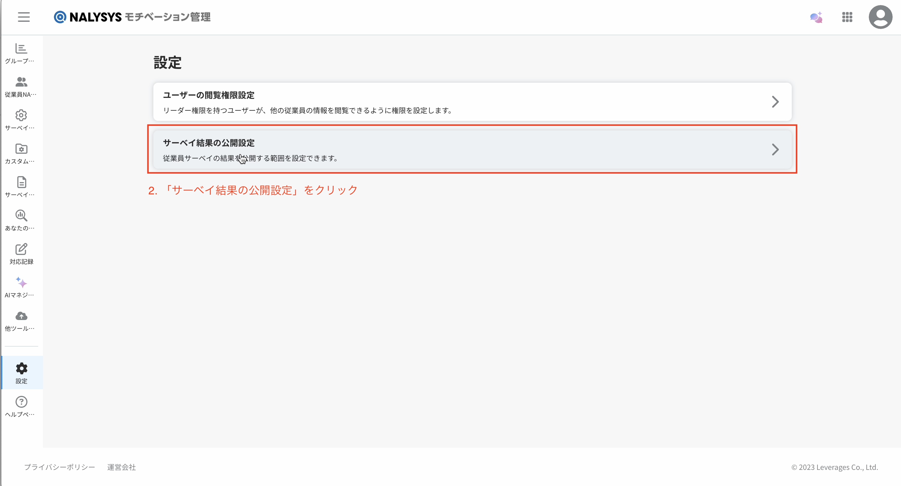 2. 「サーベイ結果の公開設定」をクリック