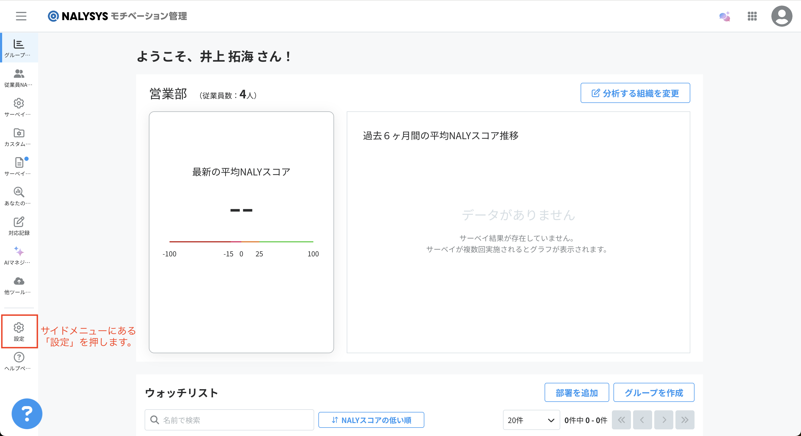 サイドメニューにある「設定」を押します。