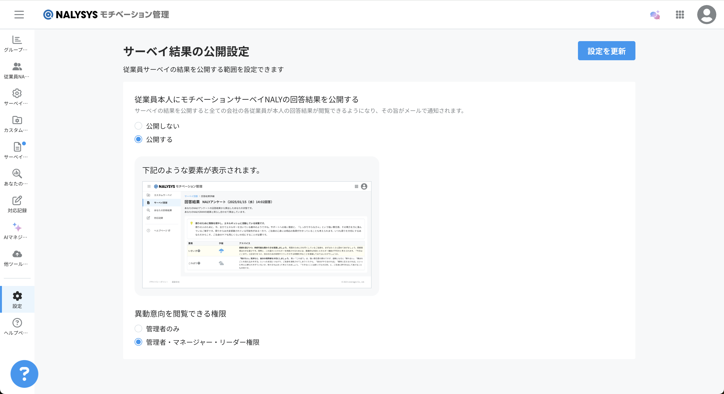 「サーベイ結果の公開設定」をクリックして、サーベイ結果の公開設定ページに移動します。