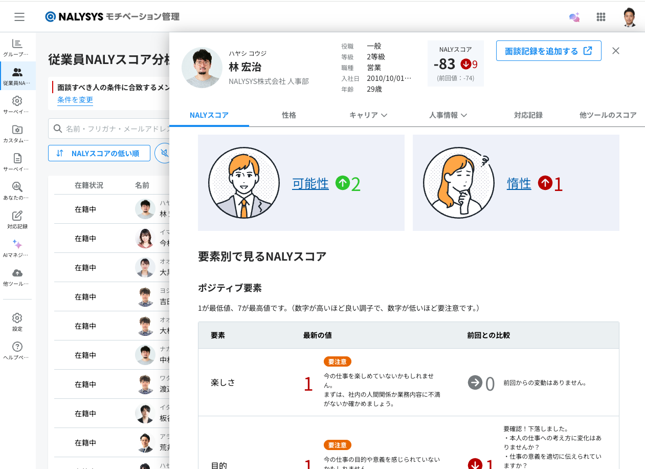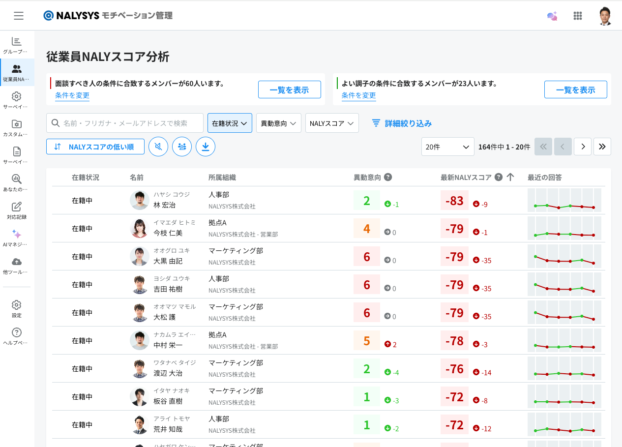 離職懸念の度合いがスコアとして一覧表示されます。異動意向が高い人や離職懸念が高い方をフィルタし、どんなポイントで悩んでいるかを確認できます。